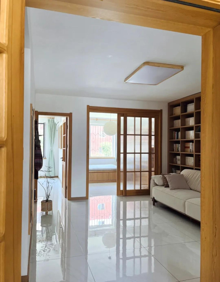 我试过,把墙面涂成奶油色、地上铺焦糖色木纹砖、加长虹玻璃隔断,确实漂亮,但结构受限,光线还是暗。