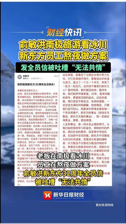 据红星新闻消息,11月16日,新东方迎来成立32周年纪念日,创始人俞敏洪身处南极发布内部信,向全体员工及支持者致谢。他在信中提出,新东方要成为“希望的播种者”,东方甄选应成“商家良知的代表”,新东方文旅要“让更多的人把世界装在心里”。内部信发布后引发关注,但并未收获预期的共鸣,有员工表示无法与正在旅游的老板共情,类似言论在多个社交平台引热议。疑有员工发文调侃与吐槽,称“今夜,所有xdfer(新东方人)都是南极人”,暗指老板的“远方”与员工的“现场”形成鲜明对比。