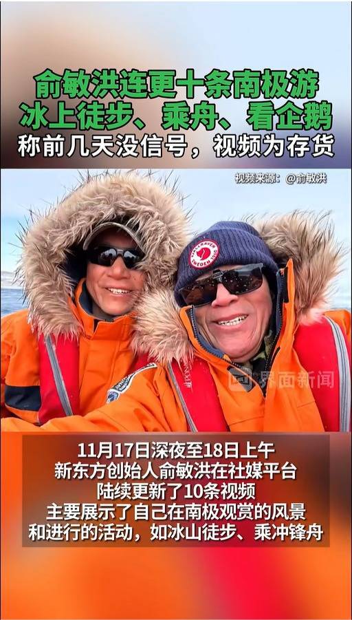 11月18日,新东方董事长俞敏洪连发10条南极游视频。视频中,俞敏洪分享穿越德雷克海峡、在威德尔海乘坐冲锋舟、偶遇帝企鹅等场景,感叹眼前是“梦幻般的南极冰川”,还能看到他与同行人员的旅行片段。
