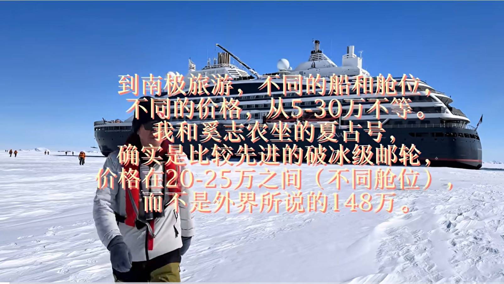 其还发布了一条视频,并在视频中表示:“到南极旅游,不同的船和舱位不同的价格,从5-30万不等,我和奚志农乘坐的夏古号确实是比较先进的破冰级邮轮,价格在20-25万之间(不同舱位)而不是外界所说的148万。”